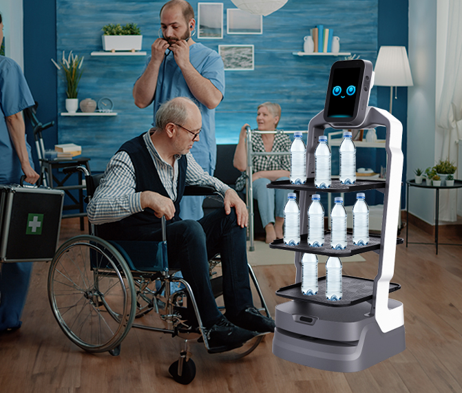Com capacidade para transportar cargas de até 60 kg, este robô é ideal para tarefas de entrega de alimentos, bebidas ou itens em múltiplos ambientes.